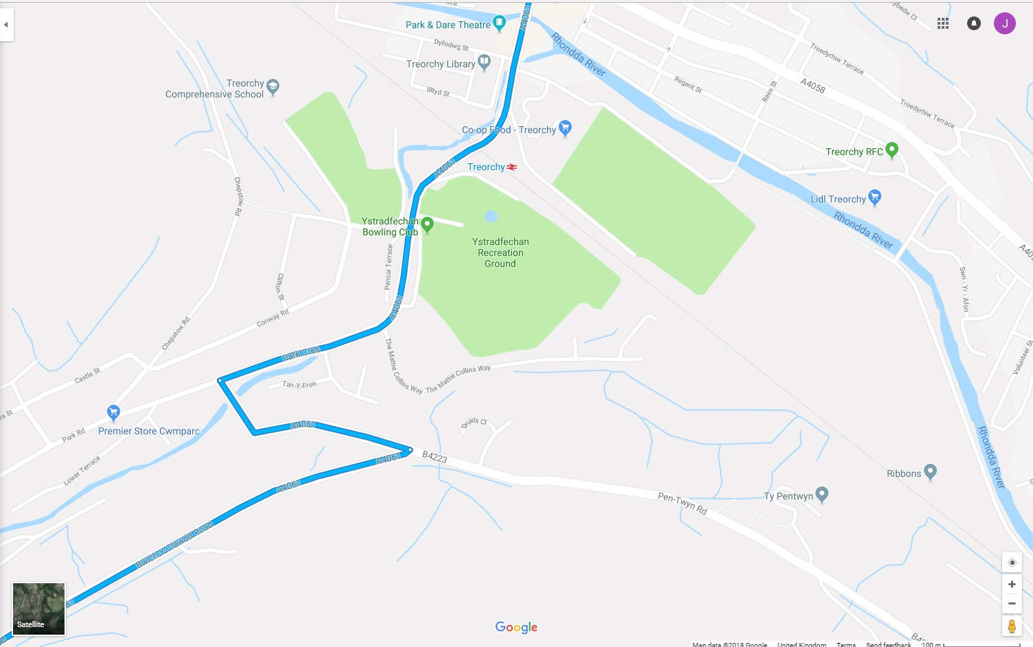 Dropping down into the valley, Treorchy will be on our left. There is a sharp left as we approach the bottom of the valley and enter the town.