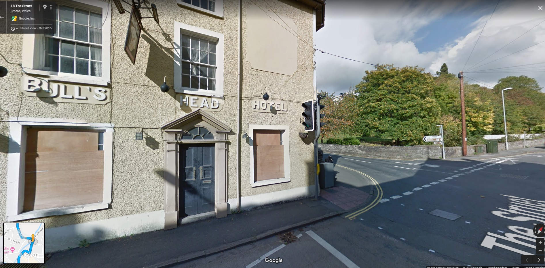 Then turn left again at the lights by the salubrious looking Bulls Head Hotel below (towards Lower Chapel and Upper Chapel B4520 - signposted). Brecon Cathedral walls will be on your right.