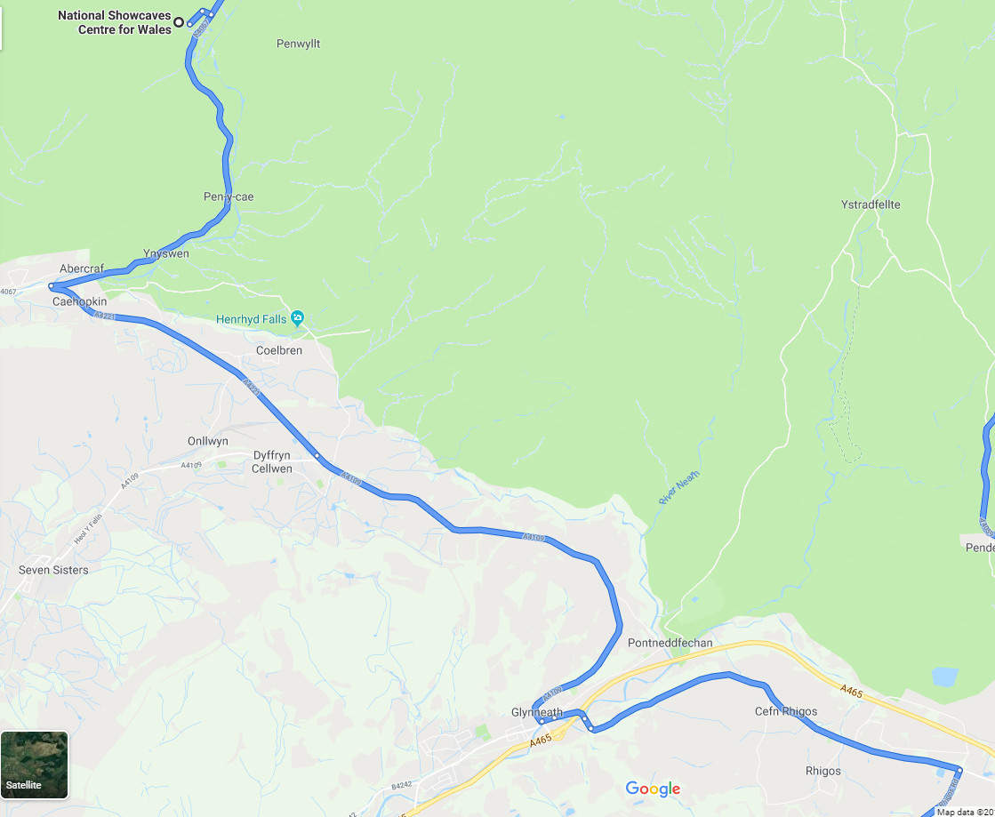 At Glynneath, take the A4109 towards Abercraf and then the A4067 towards The National Show Caves of Wales. Pass the Showcaves on your left whilst keeping a sharp eye out for pieces of Andy Reid's Tesla ;)