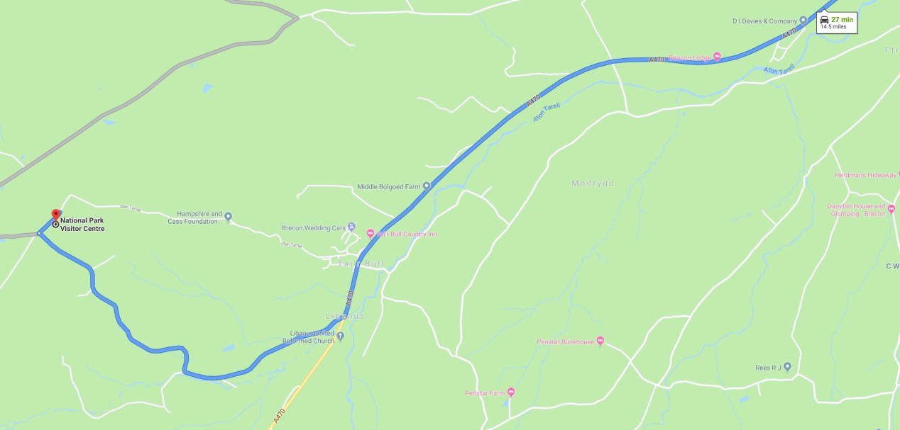 Follow the A470 towards Libanus, the Visitor Centre will be a right turn on entering Libanus (red 50mph road markings should be the final alert).