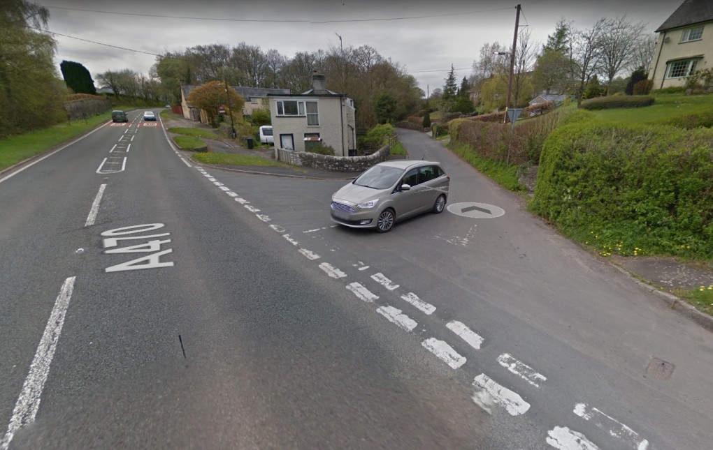 The south bound right turn, back towards Upper Chapel and Brecon, is shown below. Follow signs to Brecon and onto the B4520, Brecon Road.